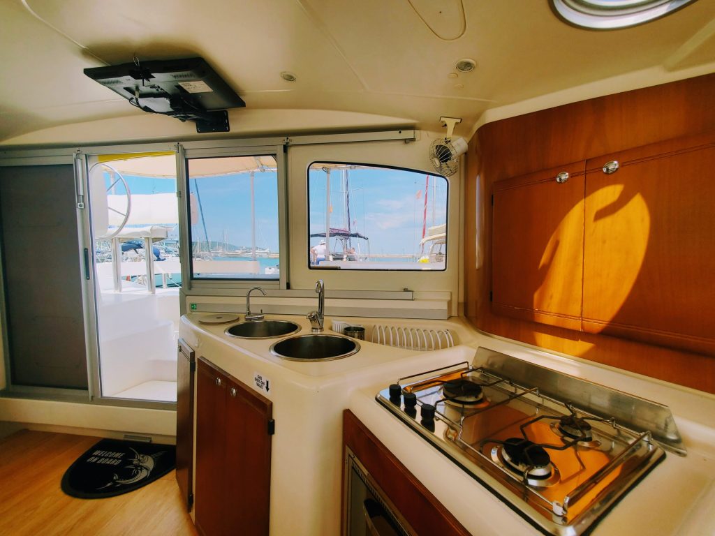Der Segelkatamaran Lavezzi 40 namens Sampei ist ein Katmaran mit 4-Kabinen und 10 Schlafplätzen in 4 Doppelkabinen und 1 Etagenbettkabinen sowie in einem Saloon.